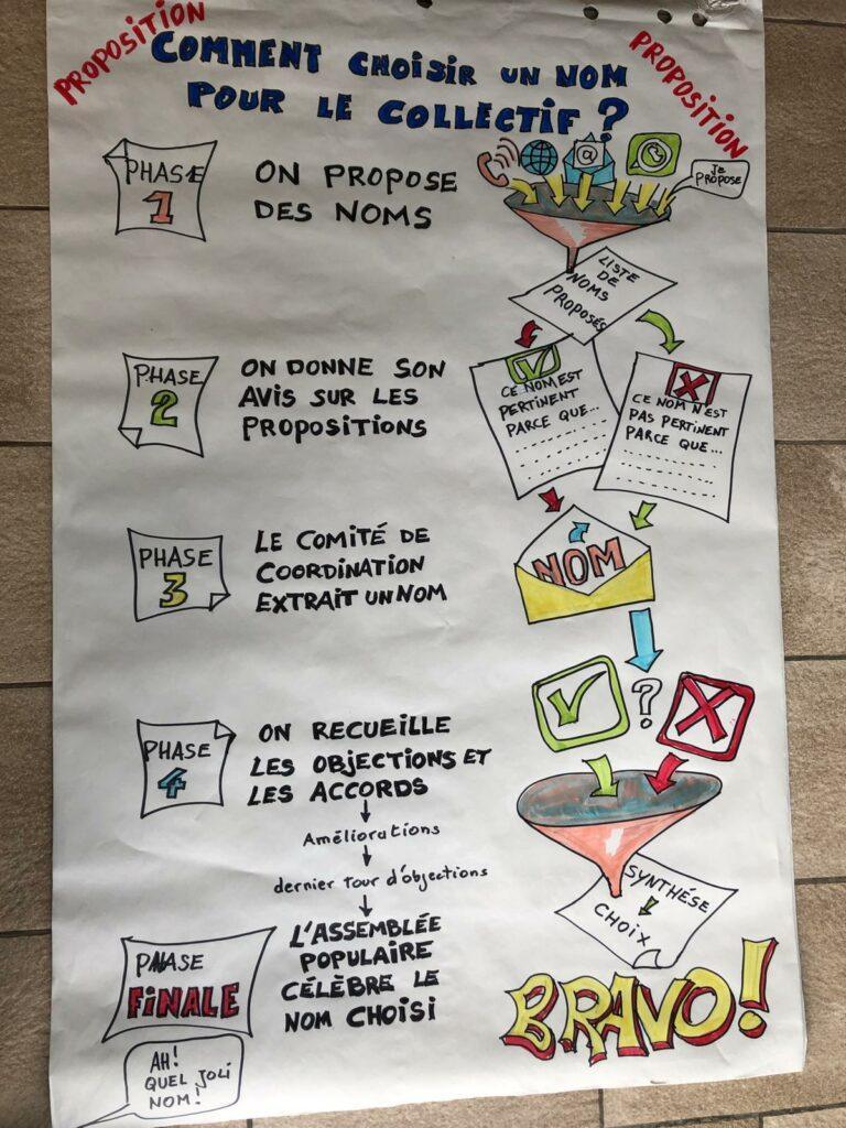 - Réponse : le but c’est de ne pas faire de vote majoritaire pour ne pas faire de clan, mais d’avoir une décision qui fait consensus (d’où le fait de travailler autour d’un nom à la fin et non deux en Assemblée)