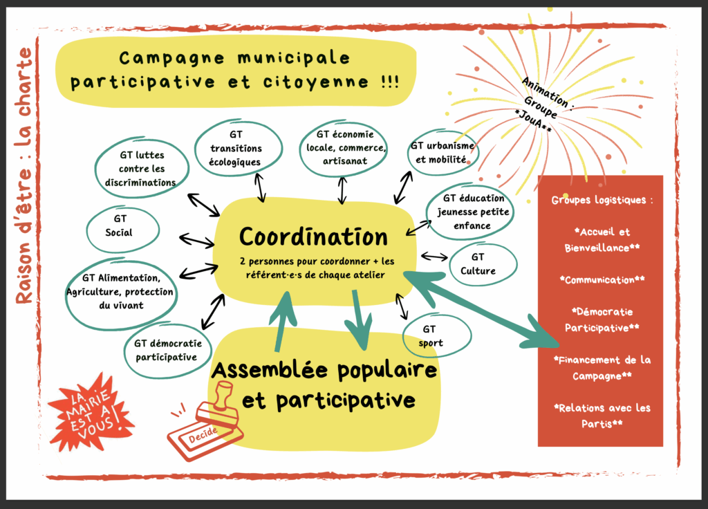 - Faire réseau entre vous, se connaître, favoriser l’entraidePartager vos expériences et affiner des sujets qui vous concernent (mobilisation d’habitants, désignation des candidat.es, etc.)S’outiller (encore et toujours !) : facilitation de réunions, outils de prise de décision, élection sans candidat, décision à zéro objection, etc.