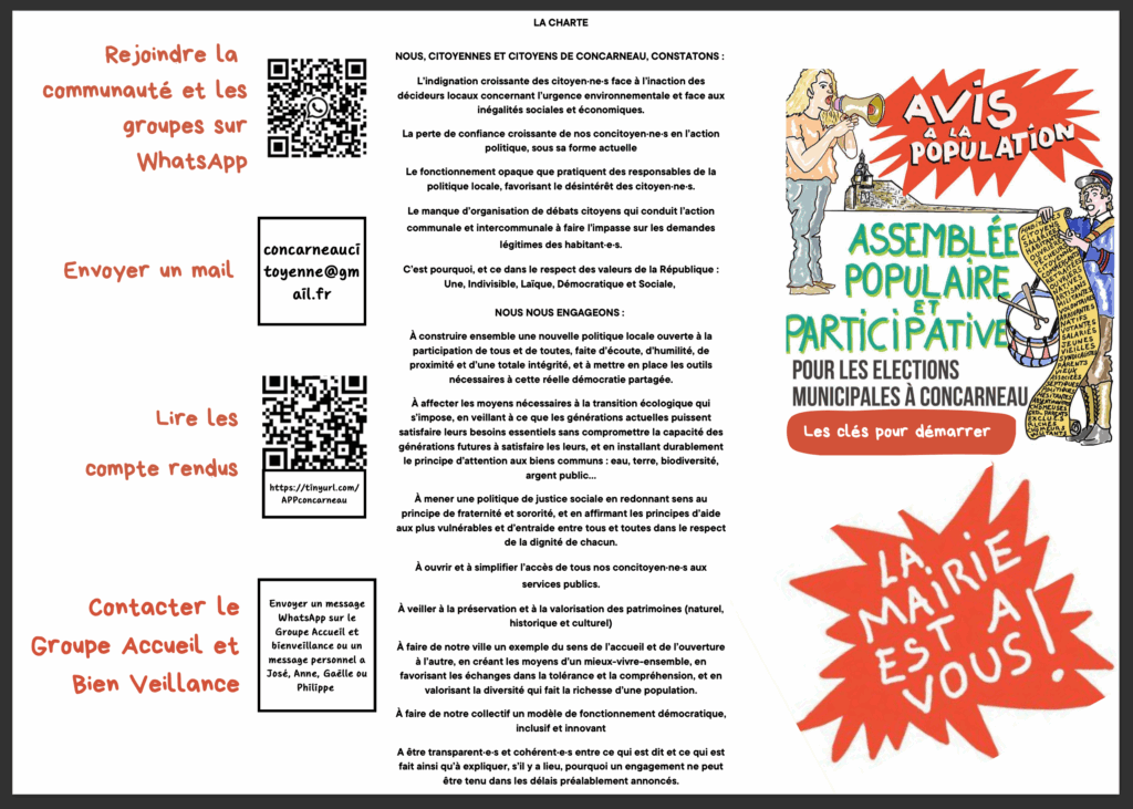 - Samedi 22 mars à Berrien -> Weekend intercollectifs des listes citoyennes et participatif pour la région Grand-Ouest : <aside> 📌 Bonjour, En tant que référentes Grand Ouest Bretagne de la Horde de Fréquence Commune, nous avons accompagné les collectifs citoyens de Plougastel, Guilers, Concarneau, Plonéour-Lanvern, Le Havre, (bientôt) Séné et nous avons été en contact avec d’autres collectifs qui émergent. Ça a sonné comme une évidence pour nous de réunir ces élans et ces forces, d’où l’envie de cette Première Rencontre locale Grand Ouest – Bretagne des collectifs citoyens prêts à s’engager pour les municipales 2026 afin de créer du lien et de l’entraide entre vous. Quand ? : samedi 22 mars 2025 Quelle heure ? 10h à 18h Où ? à Berrien (29) à la grande salle Asphodèle Les grandes intentions de cette journée sont :