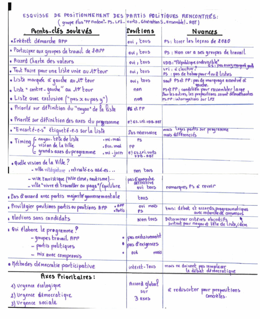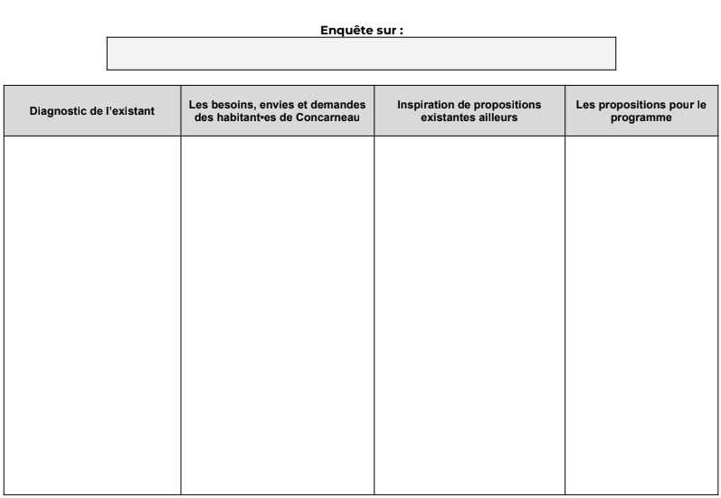 - Le groupe Démocratie Participative vous propose aussi une fiche enquête à imprimer pour guider vos réunions et vos potentielles rencontres avec des habitant•es : il ne s’agit pas de tout compléter d’un coup mais de compléter au fur et à mesure des échanges pour aboutir à des propositions (derrière colonne). Cette fiche facilitera le travail de l’équipe de rédaction du programme et du programme.