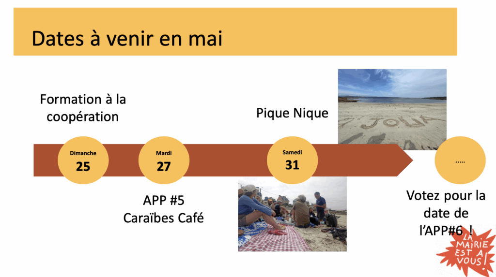- Le mardi 27 mai : prochaine Assemblée Populaire et Participative APP #5