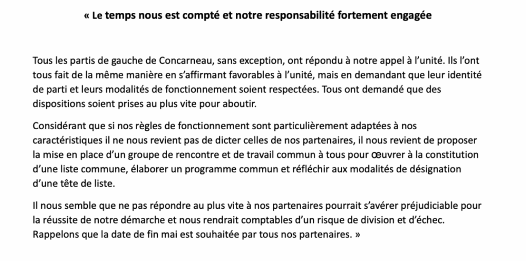 - Michèle, Serge et Patrick ont présenté la synthèse de leur rencontre après avoir rencontré toutes les formations politiques de gauche de Concarneau.