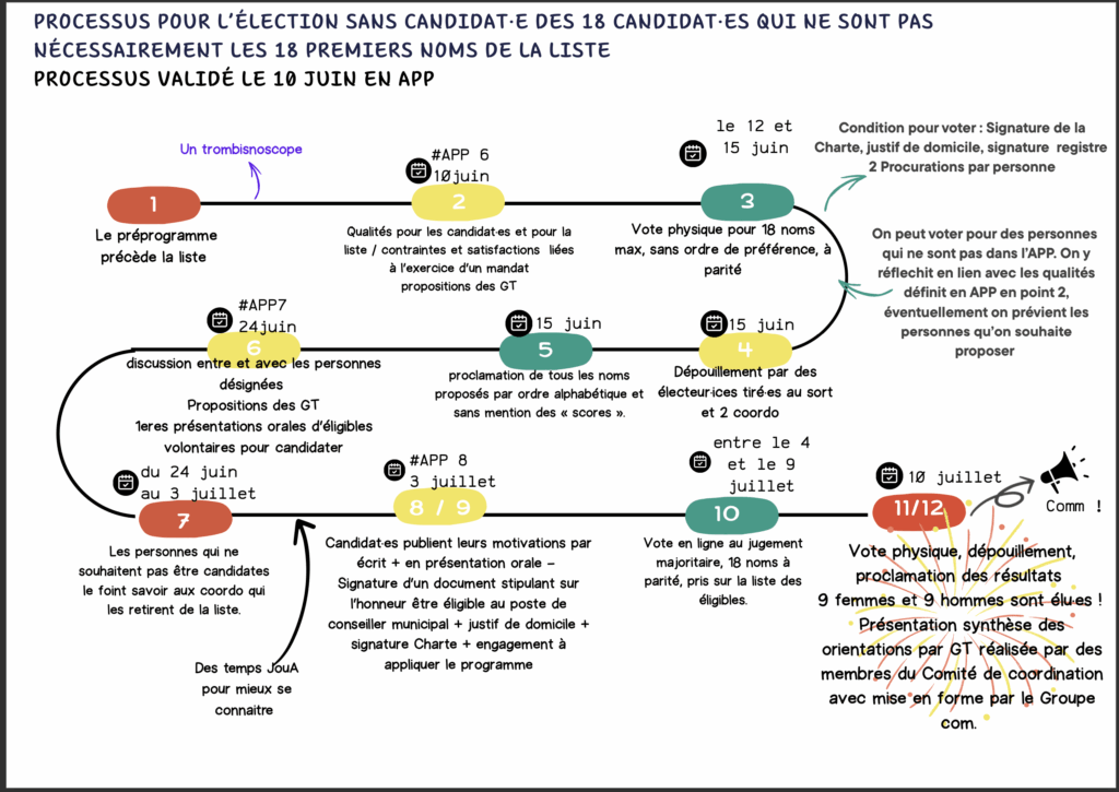 Voici la phase 1 du processus de désignation de la liste qui a été validée en Assemblée ce mardi 10 juin. Lors de cette phase qui se déroule jusqu’au 10 juillet, 18 personnes seront choisies pour sur la liste.