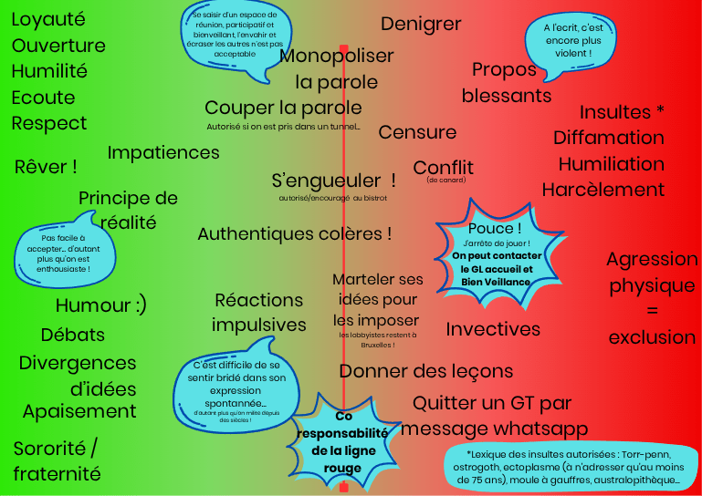 Suite à la gestion d’un conflit en interne – qui a marqué durablement y compris des membres du GL Gestion de conflit, le groupe de personnes en charge a réalisé un document qui regroupe ce qu’on souhaite et ce qu’on ne souhaite pas dans nos échanges.