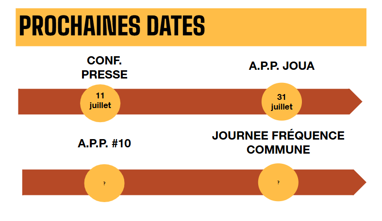 - Envoi d’un calendrier pour l’organisation de temps précis de présence collective (candidat·es sur la liste + n’importe qui de l’APP) dans l’espace public et sur les temps festifs de l’été