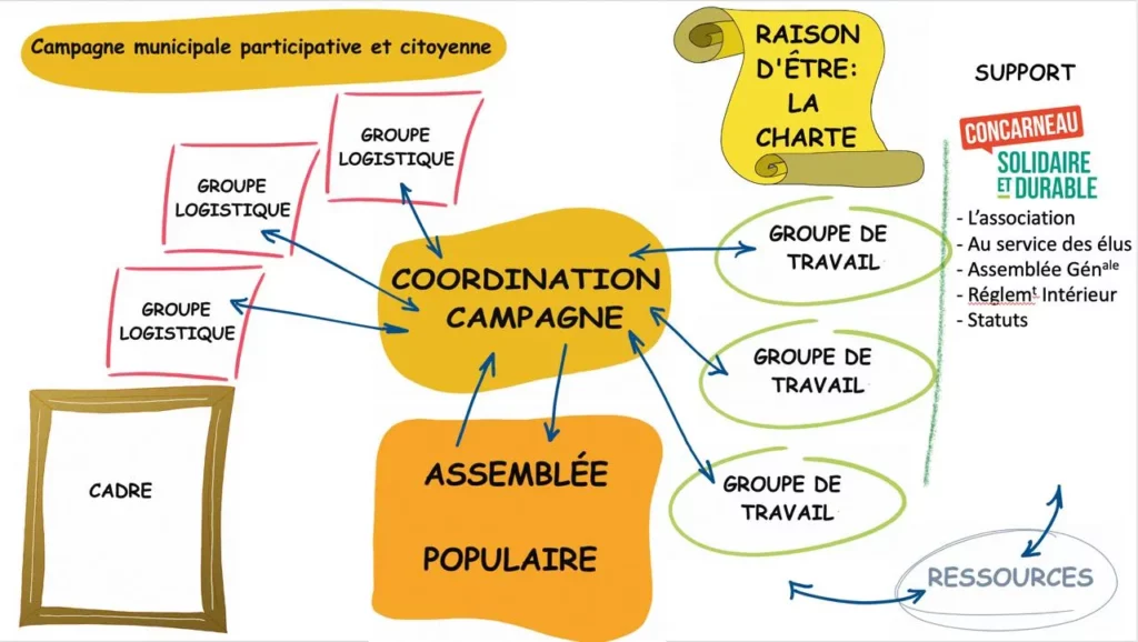 - Les groupes de travail thématique (pour construire le programme) et logistique (pour soutenir la campagne) sont autonomes sur leur périmètre d’action – mais des groupes comme le groupe “démocratie participative” ou le groupe “fun et créativité” peuvent faire des propositions sur les façons de faire et les méthode de travail.